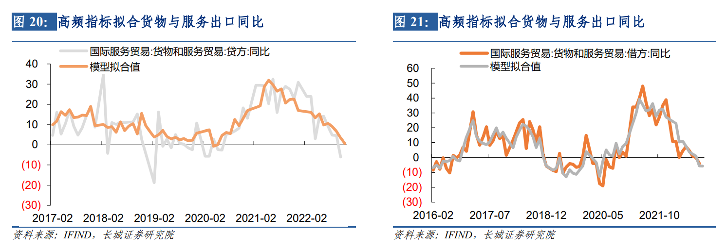 国际货物和服务贸易差额数据虽为月度公布,但大约有两个月的滞后。净出口占GDP比重虽然不高,但其增速变化较大,同时出口是衡量外需的重要指标,近年来货物服务出口/进口分别占GDP比重在20%左右,因此我们在《20220901长城证券中国经济活动指数》已经对其进行高频跟踪:我们挑选了三个指标来拟合货物和服务出口同比。其中八大港口集装箱外贸吞吐量可以较好表征出口数量;上海集装箱运价指数(SCFI)可以表现出口景气度;韩国作为主要出口国,其出口增速可以较好地体现全球外需。上述三者的解释度(R平方)达到63%以上,并且更新频率为周度或旬度,有助于较好地跟踪国际货物与服务贸易的出口。