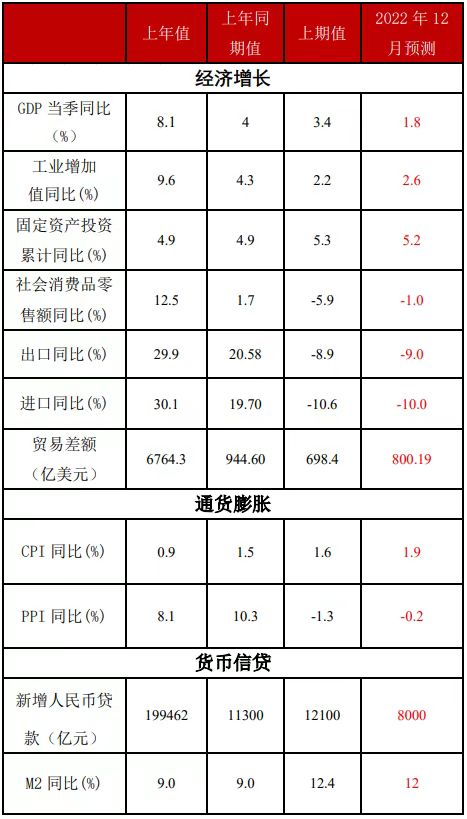 综合而言,受国际原油下行、疫情扩散、国内消费需求低迷和部分商品供应改善影响,食品价格环比有所回升,非食品相对平稳,预计12月CPI同比增长1.9%,较上期上升0.3个百分点,2022年全年CPI同比增长2.0%,较去年上升1.1个百分点。