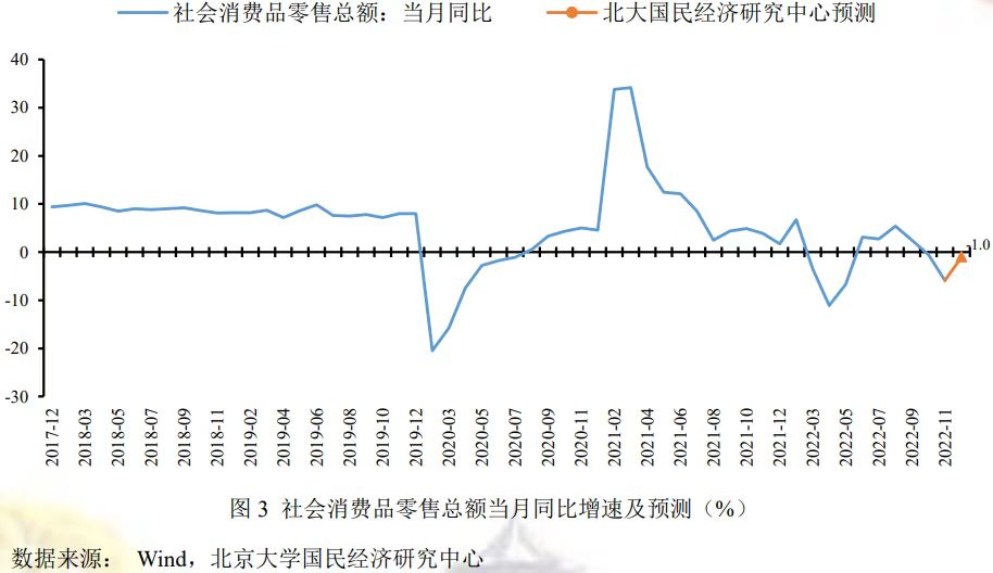 综合而言,尽管疫情防控措施优化落实一定程度上会促进服务类消费,但防疫政策的突然转向使得新冠肺炎疫情在全国范围内迎来一次集中爆发,对12月消费产生一定的扰动,同时失业率上升、居民存款增加都对消费产生一定的抑制作用,预计12月份社会消费品零售总额同比下降1.0%,较上期回升4.9个百分点。