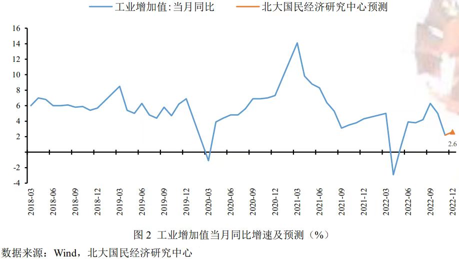 工业增加值:稳增长政策有望继续发力提供支撑,尽管全国多地疫情扩散等短期因素影响产出增速及企业预期,但未来随短期冲击影响消退,终端需求季节性回暖叠加上游成本端压力减小,工业企业生产激励存在支撑,预计12月份工业增加值同比增长2.6%,较上期回升0.4个百分点,2022年全年工业增加值同比增长3.4%,较去年下降6.2个百分点。