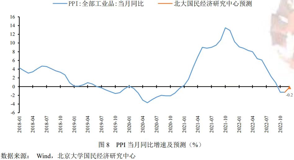 综合而言,12月国际油价受俄油限价落地和产油国减产力度不及预期影响有所下行,国内受疫情扩散对工业生产扰动影响带动生产资料价格下行,生活资料受需求端影响相对平稳,工业生产价格同比有所回升,预计12月PPI同比下跌0.2%,较上期回升1.1个百分点,2022年全年PPI同比增长4.2%,较去年下降3.9个百分点。