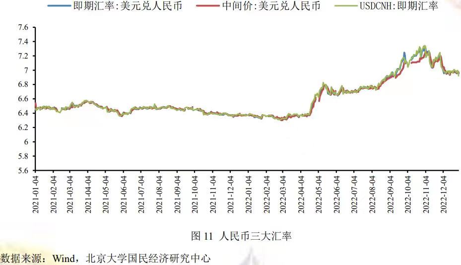 从压低因素看:第一,国内仍将采取灵活宽松的货币政策,旨在保障经济稳增长,12月6日,中共中央政治局召开会议部署2023年经济工作任务,会议强调“要坚持稳字当头、稳中求进,继续实施积极的财政政策和稳健的货币政策,积极的财政政策要加力提效,稳健的货币政策要精准有力”;而美联储在12月FOMC会议上加息50个基点,将基准利率提升至4.25%-4.5%,上调明年终端利率至5.1%;美联储主席鲍威尔表示对通胀回落有信心之前,美联储不会降息。美联储下次加息会议大概率将继续加息25个基点,货币政策仍保持外紧内松的态势。第二,中美利持续差倒挂,截止到12月31日,十年期美债收益率为3.71%,中美利差倒挂幅度较大,人民币承压。第三,海外需求趋于收缩,带动中国出口处于下行通道,削弱贸易顺差对人民币的支撑。