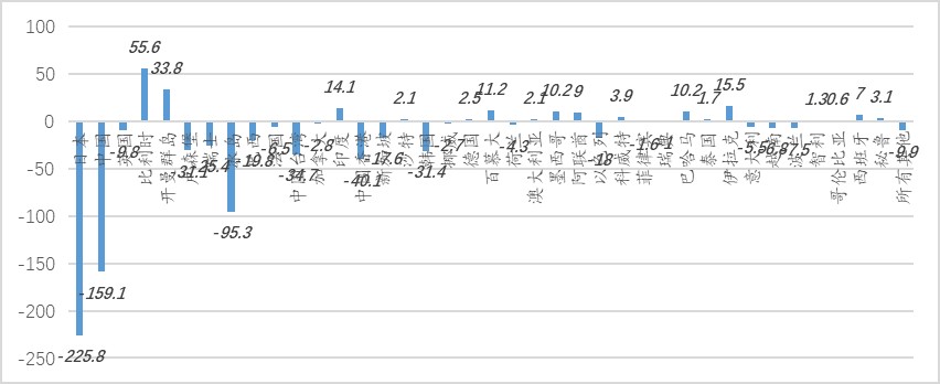 依据美国财政部网站公布的数据(Treasury International Capital (TIC) System),2022年10月全球(美国境外投资者)持有美债金额超过300亿美元的经济体一共有38个,国际投资者总计持有7.185万亿美元的美国国债。从2021年12月到2022年10月,全球(美国境外投资者)总计减持了5950亿美元的国债,其中日本减持2258亿美元,占37.9%;中国减持了1591亿美元,占比26.7%;冰岛减持了953亿美元,占比16.0%。日本、中国和冰岛减持的美债数量占这期间全球(美国境外投资者)减持美债数量的80.7%(图2)。截至2022年10月,日本、中国和冰岛在美国国债国际投资者排名中分别占据第一、第二和第八位,分别持有美国国债10782亿美元、9096亿美元和 2390亿美元。比利时和开曼群岛是这期间增持美债数量最多的,分别达到556亿美元和338亿美元。