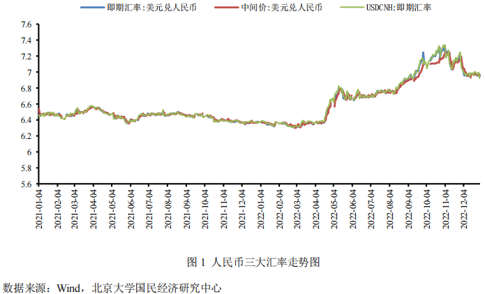 2022年12月份,受到金融市场避险情绪上涨、中美利差倒挂、美元指数稳中有降、国内疫情防控政策全面放开等因素影响,本月人民币总体呈现在6.92-7.13区间内维持双向波动的态势。其中,人民币在岸汇率从7.0791涨至6.9514,累计上涨1905个基点;人民币中间价从7.1225调升至6.9646,累计调升2123个基点;人民币离岸汇率从7.0370涨至6.9210,累计上涨1248个基点。结合2021年以来三大人民币汇率走势图(如图1所示)可以发现,主要受美联储加息预期放缓和美元指数稳中有降的影响,12月份人民币汇率整体小幅走强,呈现在6.94-7.13区间内波动态势。在岸人民币于12月5日短暂收复7.0关口,于6日跌破7.0关口,并于12月7日再度收复7.0关口,离岸人民币于12月5日收复7.0关口。主要原因包括:第一,12月7日,国务院联防联控机制综合组发布《关于进一步优化落实新冠肺炎疫情防控措施的通知》,“新十条”在部分关键问题上进行了新的改进,包括调整隔离方式(无症状和轻症感染者可以自行居家隔离)、优化核酸检测(不再检查跨区域流动人员的核酸结果、取消落地检)、保障居民购药需求等,“新十条”强化了资本市场信心,北向资金持续流入。第二,12月10日,美国劳工部发布美国11月通胀数据,美国11月CPI同比上涨7.1%,低于预期7.3%,较10月的7.7%回落0.6个百分点,表明美国的通货膨胀处于下行通道,这加强了市场对12月FOMC美联储放缓加息的预期,从而导致12月份美元指数稳中有降,从而减轻对人民币相应的压制。