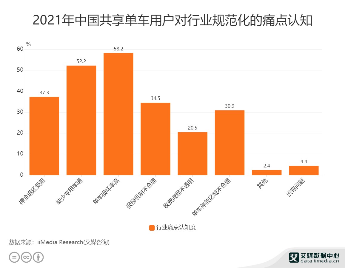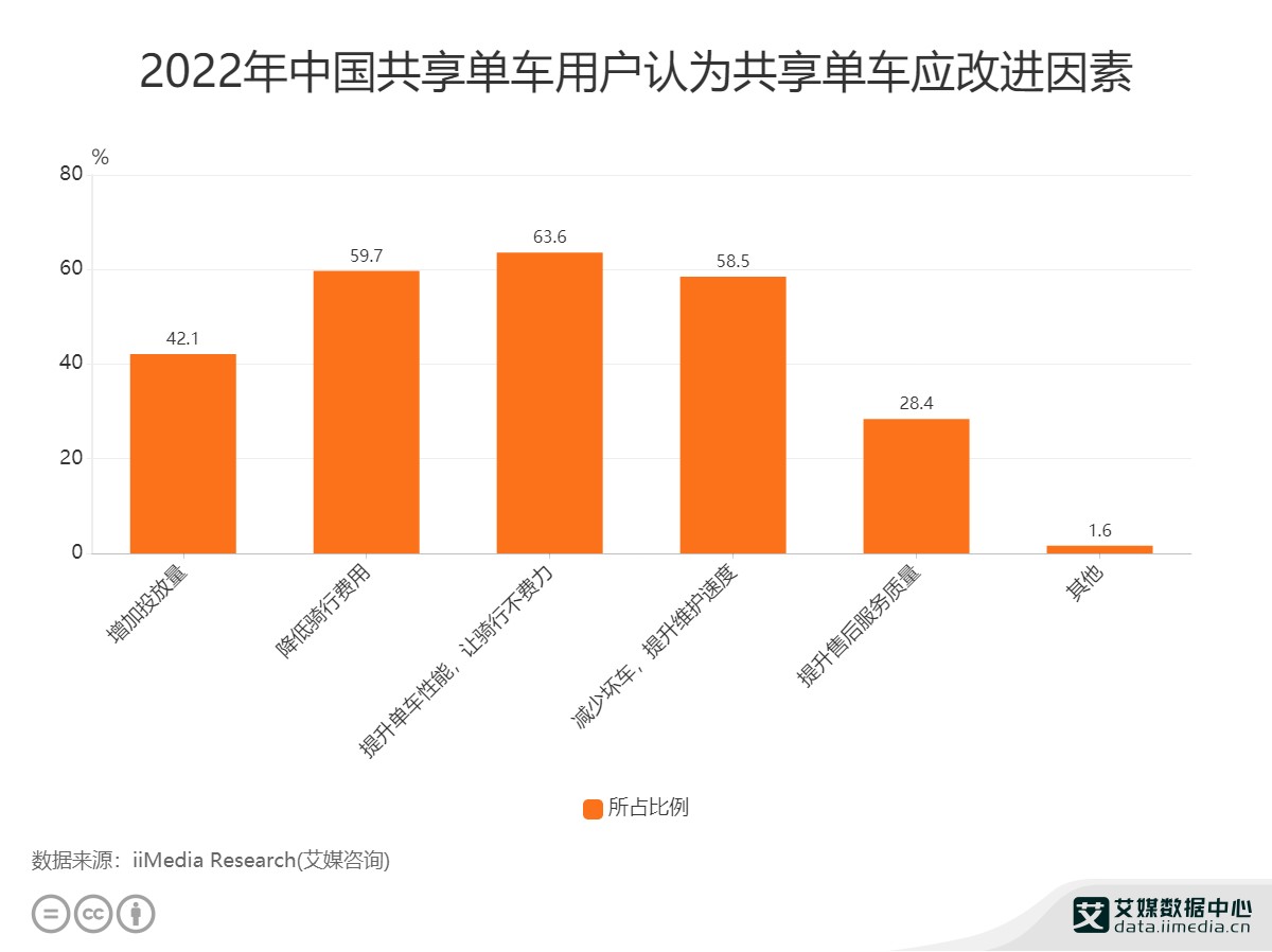 iiMedia Research(艾媒咨询)2021年数据显示,对于58.2%的单车用户而言,车辆损坏率高、质量差是降低他们使用体验的主要痛点。在2022年的调查当中,63.6%的单车用户希望提升单车性能,让骑行不费力。