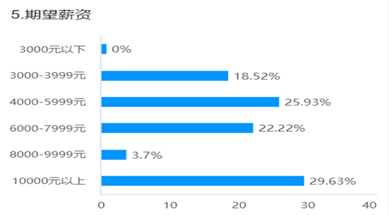 在薪资期待值上,从调查的数据中不难发现,3000元的薪资几乎满足不了民办高校毕业生的需求,毕业生期望薪资3000-4000元的占比为18.52%,4000-5000元的薪资需求相对来说更多,22.22%的毕业生期望薪资在6000-7000元,仅有3.7%的毕业生期望薪资在8000-9000元,而期望收入过万的毕业生占比29.63%。