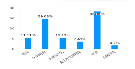 在民办高校毕业生的去向调查中,37%的毕业生选择就业,29%的毕业生选择升学考研,选择创业与入伍服兵役的毕业生占比11.11%,7.41%的毕业生无工作继续寻找,仅有3.7%的毕业生选择出国深造。