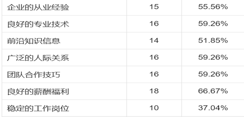 就业不单单只是平台招聘,追求人才上的创新,更多的也关乎毕业生们对于就业能带给他们什么,从收回的有效问卷中,毕业生在工作选择上最看重薪酬福利,占总比的66.67%,专业技术考验、人际关系和团队关系占比59.26%,对于前沿知识信息的要求不高,占比51.85%。