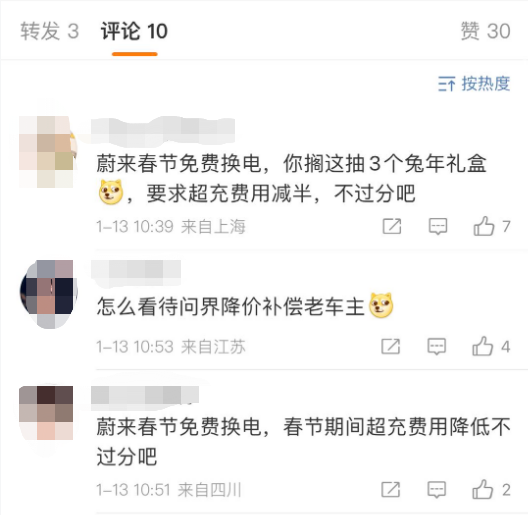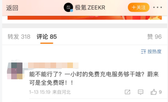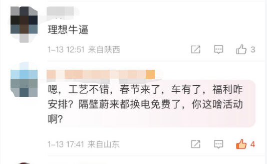 蔚来的免费补能服务引发了社交平台上的热议。有用户表示,与一些品牌的送小礼品和饮品,以及限时限量的免费充电相比,蔚来的春节福利可谓大力度,直接解决了假日出行的痛点。另外,也有品牌车主在网络上表达了对蔚来用户的羡慕,甚至有网友直接在理想官微下留言表示,隔壁蔚来都有免费换电了,你们有什么活动?亦有部分网友表示,蔚来将整个行业的充换电服务“卷”到了春节。