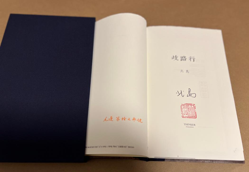 所以,我要了一本牛津特装《歧路行》,布脊,花梨木板封面封底,毛边本,签名本,共做十本,五本销售,我这本是第三号。有此一册,我的“北岛专题”可以告一段落了。