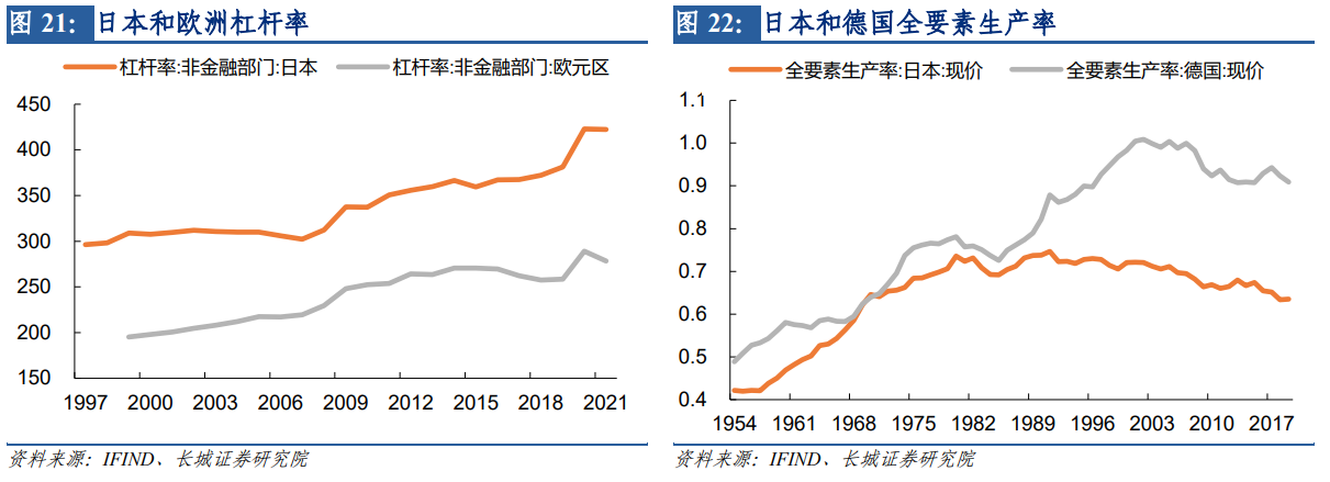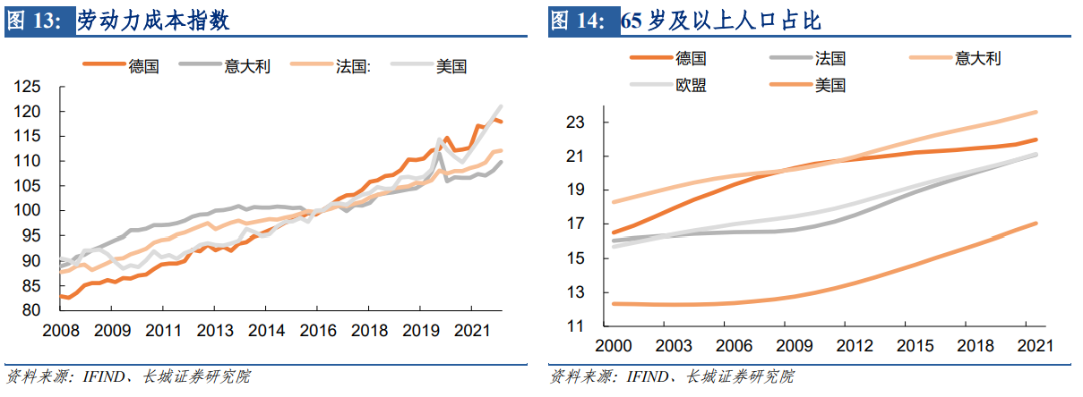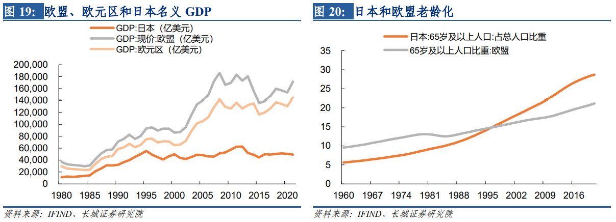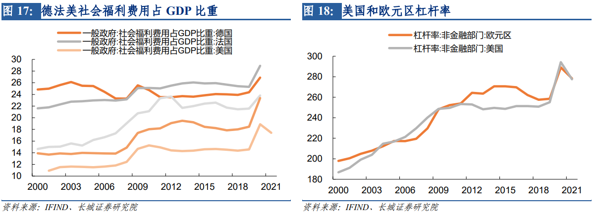 为何欧元区的信贷创造能力会减弱?我们也在之前的多次报告中阐述过,随着劳动力增速的下降、老龄化的加重,国家的偿债能力在下降。这一点从消费者生命周期理论也可以看出,在平均年龄越过中年之后,其消费者的收入增速和支出增速都将不断下降,而且收入增速降速会超过支出增速,因为养老是一项刚性支出。欧洲劳动力成本较高的另外一部分原因是福利过高。欧盟主要国家的社会福利费用占GDP比重都高于美国,而且有些国家在欧元成立之后大幅提升福利费用。另外一个主要原因是宏观杠杆率大幅上升。2021年欧元区和美国的非金融部门杠杆率都达到了278%的高位,但美元作为全球储备货币,享受着全球铸币税,杠杆率还能进一步上升。欧元则承受着财政可持续性的压力,2011年欧债危机爆发就是一种表现,今年英国养老金事件也是对加杠杆的负面反应。