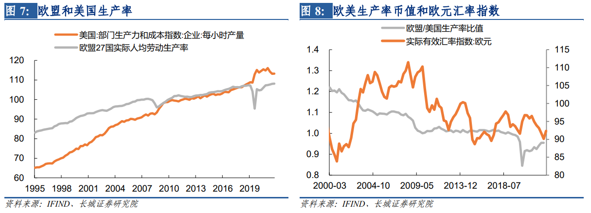 从劳动生产率来看,欧盟实际人均劳动生产率2022年第三季度比2008年第三季度增长了1.08倍,而美国增长了1.22倍,增速慢了11.5%。欧元的实际有效汇率在2022年第三季度末为90.12,比2008年的第三季度末107.96回落了16.5%,这两个数据相差不大,可以反映出劳动生产率慢的国家实际汇率也是贬值的。