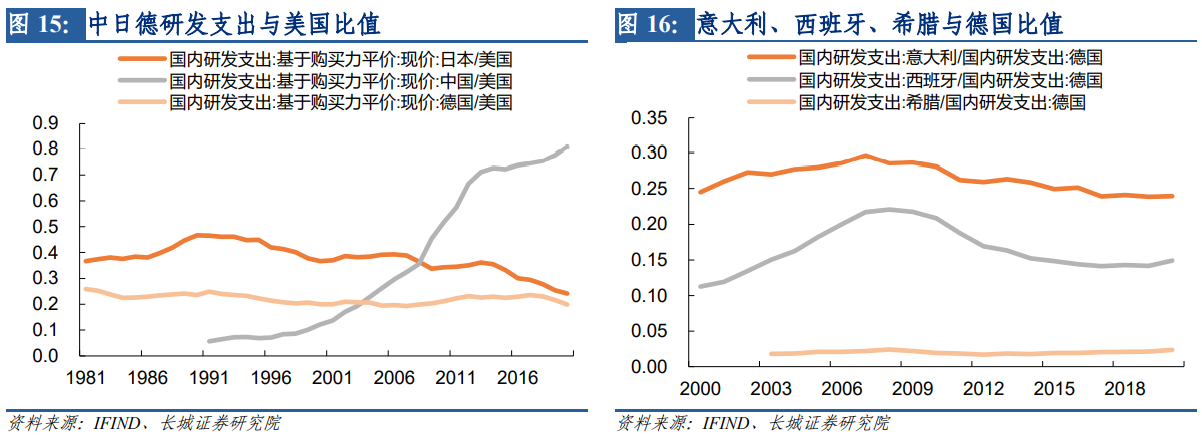 为何欧元区的劳动生产率会变慢?我们在《20220621促长期增长,盼改革实效——宏观经济半年度报告》中有提到:全球科技技术进步一般是十年为一个周期,2010年至2020年正处于智能手机快速发展的阶段。在这个阶段欧洲所处的产业链位置并不重要,参与程度并不大,前期研发投入也不够。我们在《20220408近期日元为何快速贬值?》中也阐述过由于研发投入不够,日本也发生过生产率不断下滑的现象。欧元区基本上与日本相似,德国的研发投入相对于美国来说基本上是停滞的,其他欧洲国家更加严重,而且也是从2008年开始不断下滑的。