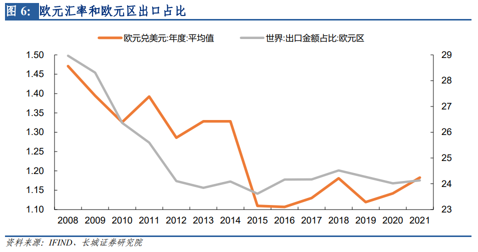 欧元的持续贬值是欧洲陷入美元计价GDP增长停滞的主要原因。斯蒂格里茨也认为罪魁祸首就是欧元。根据购买力平价理论,名义汇率等于实际利率+相对通胀。一国实际汇率的长期决定因素是相对劳动生产率,如果相对于别国,本国生产出的商品没有竞争优势或者成本高昂,出口自然会下降,产出也会下降,货币也就会贬值。2008年时欧元兑美元还有1.47,到了2021年只有1.18,甚至在今年跌破了1。欧元区出口占世界的比重在2008年时还有接近29%,到2021年就下滑至24%左右。