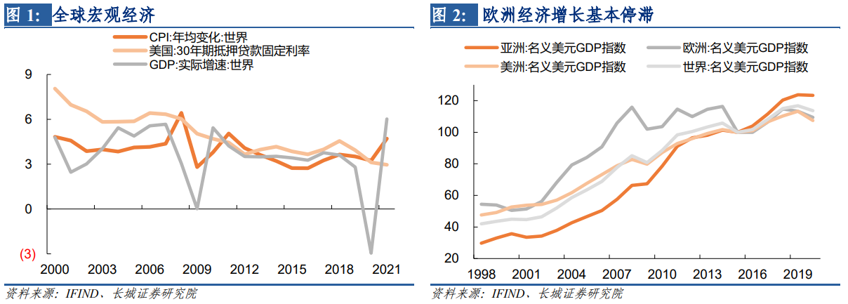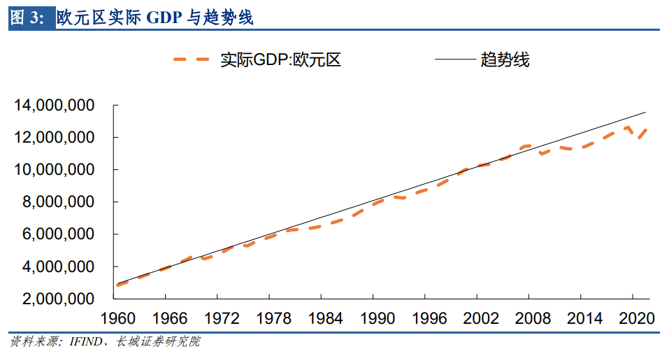 12月7日,欧盟统计局公布了欧元区第三季度GDP环比增长0.3%,比二季度的0.8%继续下滑。11月11日,欧盟委员会发布的2022年秋季经济预测报告,预计欧元区2023年仅增长0.3%,这些数据都表明欧洲经济增速在持续放缓。根据我们长城证券宏观团队预测,2023年欧元区经济增速可能为负。这不仅暗含着欧洲将再次发生经济衰退,也预示着从2008年美国次贷危机以来欧洲的经济停滞仍在持续。