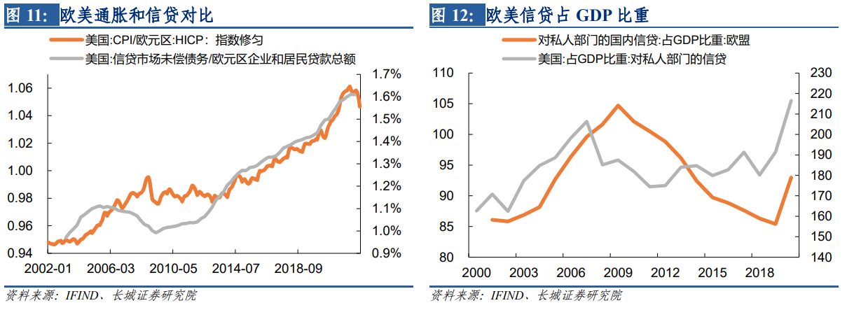 货币数量理论告诉我们,通货膨胀是由于货币供应量增加造成的,两国的相对通胀是由两国的货币供应量造成的。我们用欧美两国的信贷总额来当作货币供应量,其比值大致领先通胀比值一年多的时间。由此可以看出,欧洲通胀相对较弱的主要原因是信贷需求较弱,货币供给量增速较低。