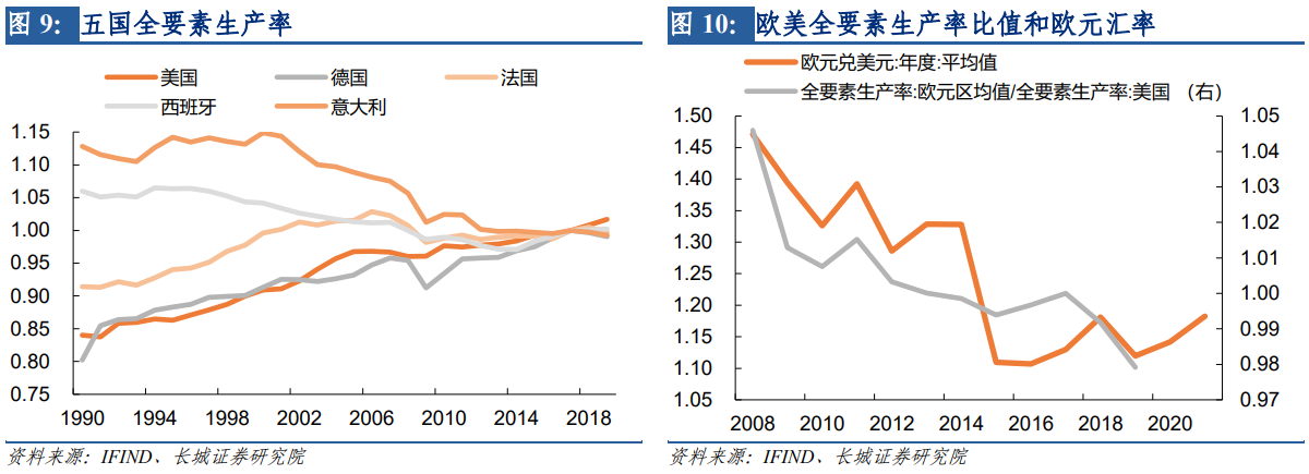 我们再把德国、法国、意大利和西班牙的全要素生产率来与美国相比,可以看出欧元区各国与美国的比值从2008年开始就持续下滑,且与欧元实际汇率的持续贬值亦步亦趋。这反映了欧盟在美国次贷危机之后接连发生欧债危机,自身的技术进步和效率提高受到了极大的限制。