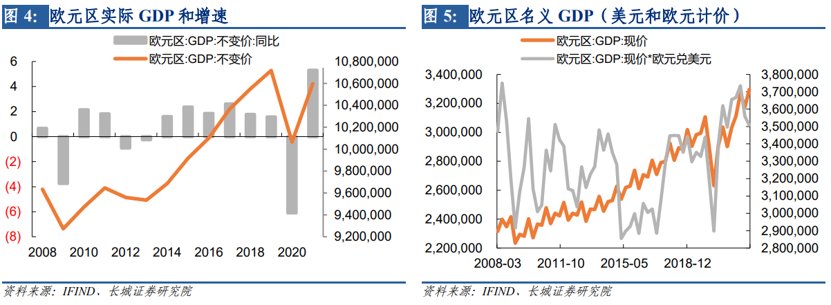 我们再近距离观察一下欧元区2008年以来的经济增速。欧盟统计局数据显示欧盟实际GDP从2008年的9.64万亿欧元持续上升至2021年的10.6万亿欧元,累计增速接近10%,年均增速达到0.77%。世界银行公布的数据显示欧元区实际GDP从2008年的11.49万亿美元持续上升至2021年的12.45万亿美元,累计增速接近8.36%,年均增速达到0.64%。从数据来看,欧元区13年产出增加了1万亿欧元或者0.96万亿美元,实现小幅正增。这看似与我们所说的增长停滞不一致。