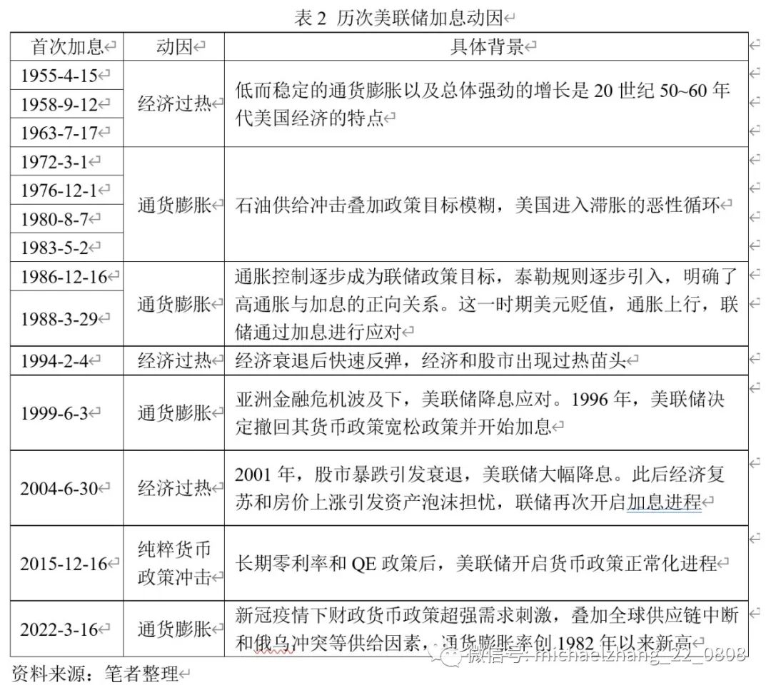 美联储历次加息的动因存在较大差异(表2)。我们在Hoek等 (2022)的基础上,将美联储加息动因分为三种类型:经济过热、通货膨胀和纯粹货币政策冲击。