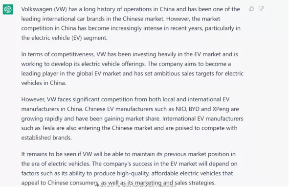 ChatGPT认为,大众在中国发展历史悠久,一直保持市场领先,但近年来中国的市场竞争日益激烈,尤其是在电动汽车(EV)领域,大众有点吃力。现在,大众一直在电动汽车市场投入巨资,并在中国市场快速开发其电动汽车产品。ChatGPT指出,大众在中国面临来自本地和国际电动汽车制造商的激烈竞争,这些企业发展迅速,市场份额不断扩大。大众汽车能否在电动汽车时代保持其先前的市场地位,取决于其生产对中国消费者具有吸引力的高质量、价格合理的电动汽车的能力,以及其营销和销售策略。