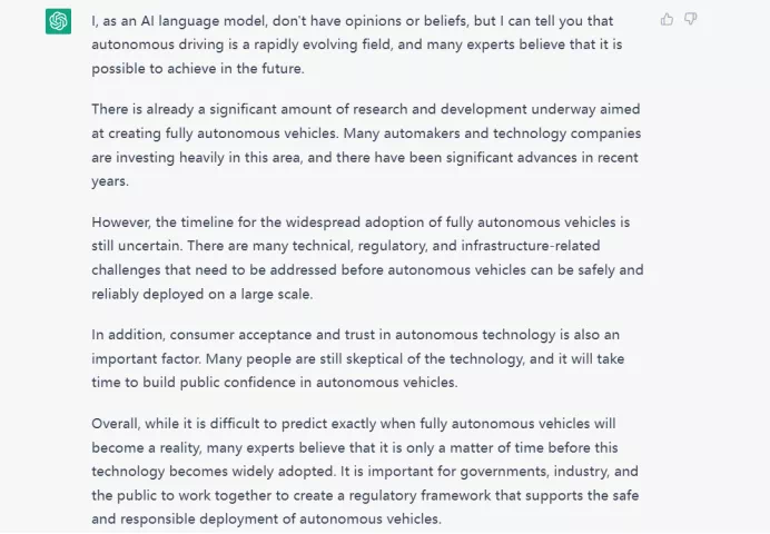 当然ChatGPT还是指出了自动驾驶中存在的问题。比如需要解决许多技术、监管和基础设施相关的挑战。此外,消费者对自主技术的接受度和信任度也是一个重要因素。许多人仍然对这项技术持怀疑态度,建立公众对自动驾驶汽车的信心需要时间。