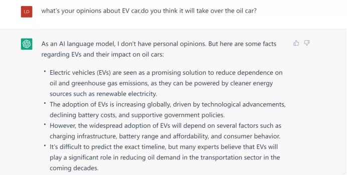 令人好奇的是,如果我们用ChatGPT来提问几个关于中国汽车的问题,它会怎么回答呢?我们准备几个高难度的问题来试试AI。首先抛出的第一个问题比较简单,考虑到中文可能比较难以被AI识别,于是我们换成了英文提问。我们发出的第一个问题是:怎么看电动车的发展,它会取代燃油车的发展吗?