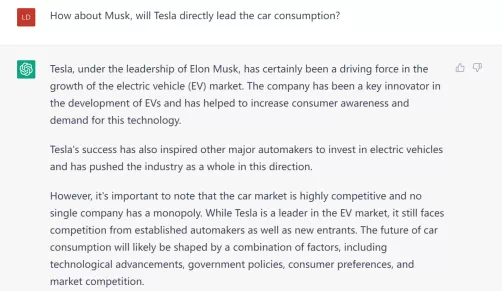 于是在第二个问题上,我们增加了难度。第二个问题是:你怎么看马斯克这人,特斯拉还能继续引领电动车消费吗?当然,ChatGPT的回答很有水平,属于先扬后抑性质。它在回答中,首先赞美了特斯拉在电动车普及和创新上的成绩,随后指出市场竞争激烈,没有一家公司可以垄断。随后,它指出特斯拉仍面临来自老牌汽车制造商和新进入者的竞争。