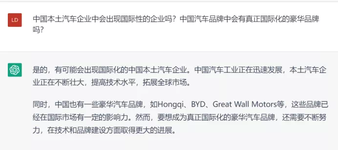 所以在接下来的问题,ChatGPT还是一如既往的看好比亚迪。在回答“中国本土汽车企业中会出现国际性的企业吗?中国汽车品牌中会有真正国际化的豪华品牌吗?”这两个问题时候,ChatGPT举例了三个车企,红旗、比亚迪和长城。红旗作为自主此前唯一的豪华车,确实有这地位,而比亚迪和长城,可能还算不上豪华车。不过这两者也都有自己的豪华品牌,比亚迪甚至有价格超过100万元的仰望品牌。