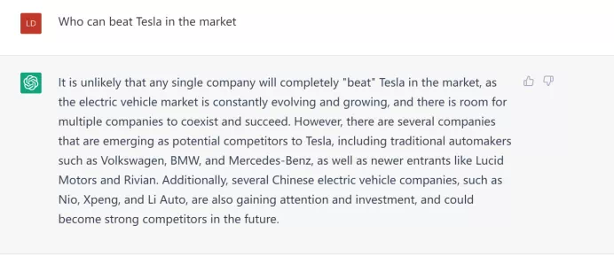 甚至,ChatGPT还分析了企业能否持续引领市场的关键,它的看法是“汽车消费的未来可能会受到多种因素的共同影响,包括技术进步、政府政策、消费者偏好和市场竞争。”这可以说很全面了。顺藤摸瓜,接着问它,谁会是特斯拉的挑战者,或者说谁能在市场上战胜特斯拉?ChatGPT的回答是,不是一家企业,而是一堆企业,甚至它还提及了中国车企——这可能是因为在之前的对话中问到了中国车企的表现。
