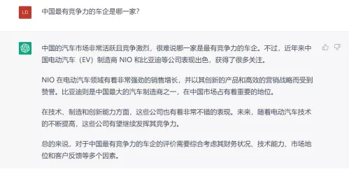 在ChatGPT的回复中,它提到了几个企业,包括奔驰、大众、宝马,还提到了一些美国的造车新势力。比如Lucid Motors 和 Rivian。在中国的电动车企业中,“蔚小理”是比较有名的,也都是在美国上市,因而很容易被系统提出,这不难理解。不过,这也侧面说明了这三者在美国社会中还是会有比较强的存在感。在中国车企中,是否ChatGPT就认为这三者是未来的代表呢?其实也不是。在接下来的问题中,我们询问它,中国最有竞争力的车企是哪一个,它的回复中只有两个车企。