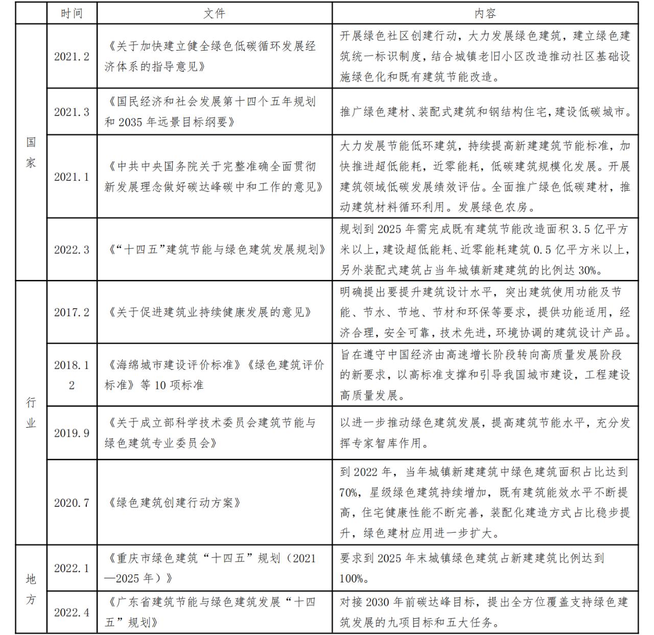 绿色建筑要求下房地产绿色转型要求衍生。与房地产行业紧密相关的装配式建筑、既有建筑节能改造、低能耗建筑等绿色建筑相关概念是十四五规划发展的一个重点,受到政府大力支持。行业及地方多对建造流程的材料技术、新建面积绿色占比等提出具象指标,房企绿色转型热点随之开辟。