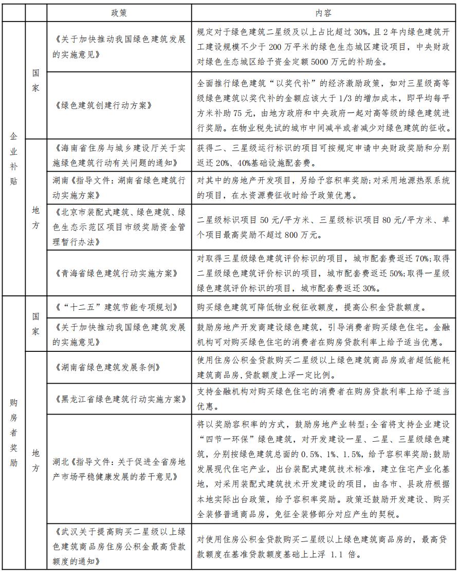 建筑和房地产行业的绿色转型离不开政策激励及资金保障。2012年财政部、住房和城乡建设部《关于加快推动我国绿色建筑发展的实施意见》明确提出对高星级绿色建筑提供财政激励政策,为推进绿色生态城区建设,保障绿色建筑发展提供一定的资金保障。目前主流补贴激励政策主要针对于两方面,一是对开发企业的补贴,二是对购房者的奖励。