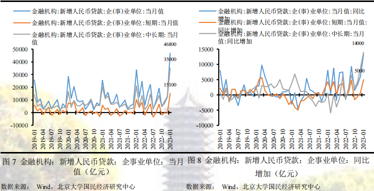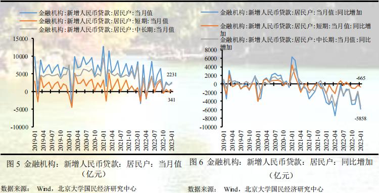 企事业单位贷款方面,1月企事业单位短期贷款15100亿元,同比多增5000亿元,企事业单位中长期贷款35000亿元,同比多增14000亿元,表明在稳增长政策的主导下企事业单位的中长期贷款得到较大支撑,信贷结构持续改善,这一方面主要得益于一揽子稳经济政策陆续落地生效,制造业和基建发挥了重要的作用,包括6000亿元的政策性开发性金融工具、5000多亿元专项债结存限额、2000亿元设备更新改造专项贷款、3000亿元农业农村基建投资、保交楼专项资金、金融支持房地产等各类政策,另一方面在疫情影响消退后企业预期得到显著改善,产需两端景气度得到提升,数据显示1月制造业PMI大幅扩张,高于荣枯线,信贷需求回暖。