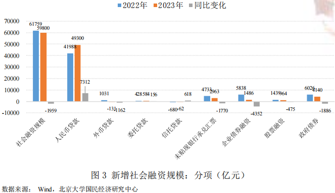 2023年1月社会融资规模59800亿元,较去年同期少增1959亿元,高于市场预期。其中,人民币贷款49300亿元,同比多增7312亿元,是本月社融规模的重要支撑;企业债券融资1486亿元,同比少增4352亿元,政府债券4140亿元,同比少增1886亿元,未贴现银行承兑汇票2963亿元,同比少增1770亿元,是本月社融规模少增的重要拖累。可见,在一系列稳增长政策的推动下,以及市场预期随疫情防控政策转变得到改善,全国社会融资规模整体实现“开门红”。