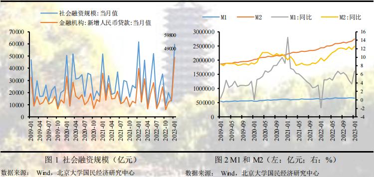 2023年1月,社会融资规模59800亿元,较去年同期少增1959亿元,高于市场预期;新增人民币贷款49000亿元,同比多增9200亿元。伴随疫情影响趋于消退,市场预期显著改善,加之近期多项稳增长政策持续落地生效,信贷支持力度较大,拉升企事业单位信贷规模,实现2023年信贷“开门红”,但是居民户信贷需求恢复还需时日,导致部门信贷结构持续分化,拖累整体信贷规模。