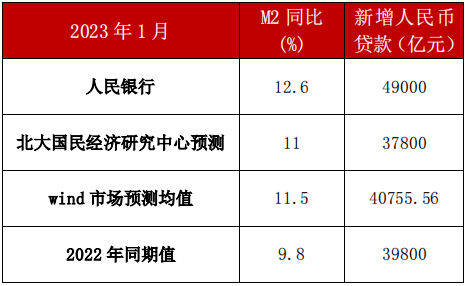 2023年1月末,狭义货币(M1)余额65.52万亿元,同比增长6.7%,较上期提高3个百分点;广义货币(M2)余额273.81万亿元,同比增长12.6%,较上期提高0.8个百分点,创自2016年4月以来的新高。可见,在疫情影响消退,国内经济正式全面恢复的开端,国内货币政策环境较为宽松,在政策性开发性金融工具配套融资加快投放等政策支持下,信贷规模大幅多增,同时较强的信贷派生能力共同支撑M2同比增速大幅走高。此外,伴随人民币汇率升值,春节前企业结汇需求显著增加,也支撑M2同比增速。我们预测1月末M2同比增长11%,低于实际值1.6个百分点,主要是低估了1月如此强劲的信贷规模。