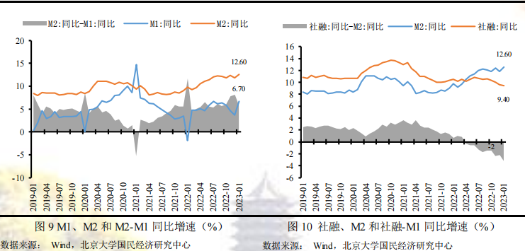 从M2-M1增速来看,1月末M2与M1的同比增速差为5.9%,增速剪刀差较上期下降2.2个百分点,表明1月末货币存款活期化明显提升,预示企业投资活力恢复较快。这种现象的背后显示出自去年疫情防控政策转变,感染高峰过后,市场预期得到较大程度的改善,企业投资明显改善。此外,2023年春节在1月和2022年春节在2月形成错位效应,造成活期存款的低基数效应。