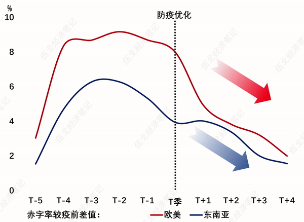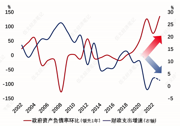 2. 国际经验表明,财政政策退坡是疫后各国普遍现象,也是内生经济动能修复过程中的必然。从我国来看,三年来受到疫情、地产等多重拖累,政府尤其是地方政府的资产负债率显著抬升。历史上,前期的资产负债表受损都将滞后地掣肘下一年财政支出的力度。