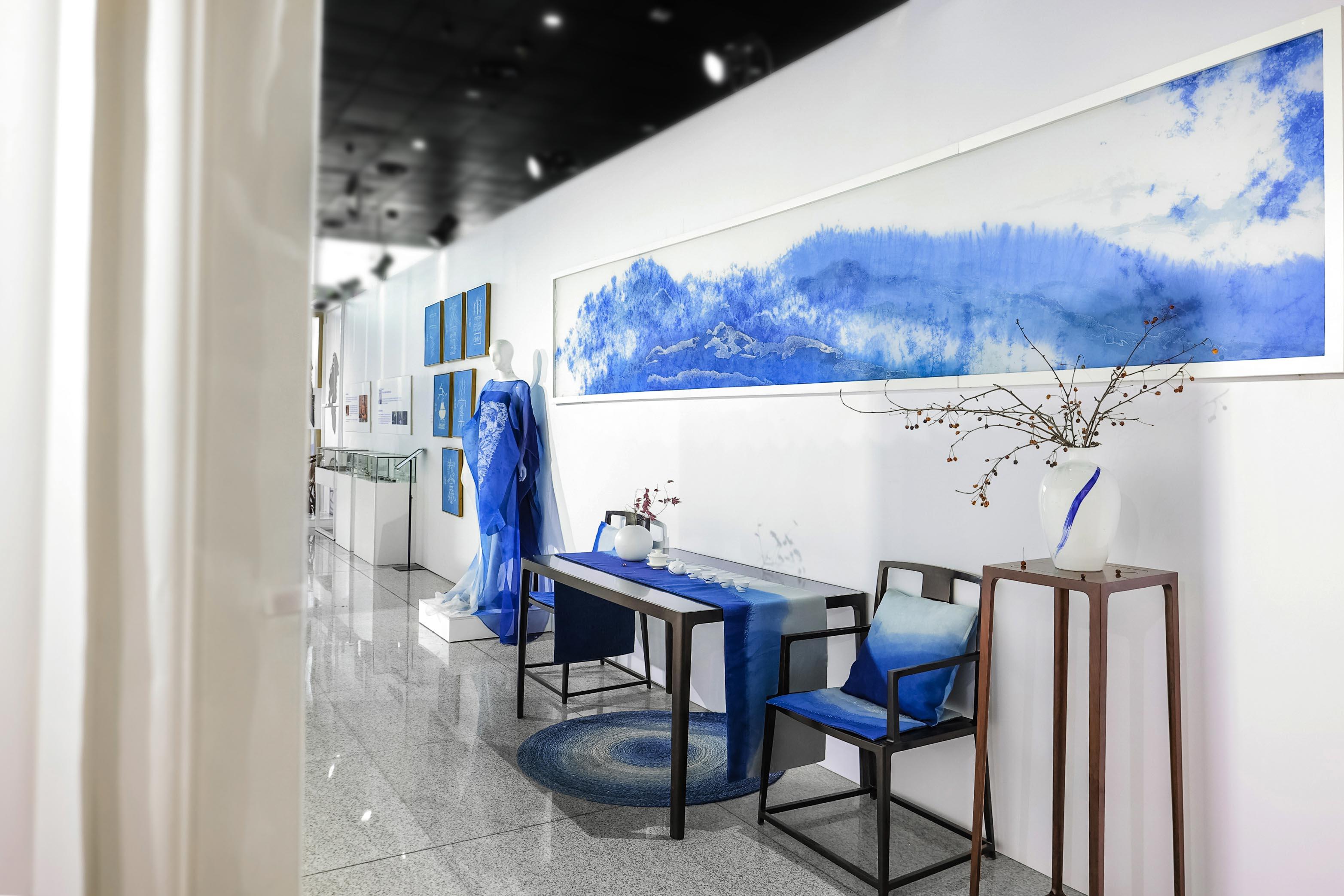 由清华大学美术学院教授李薇与白族扎染技艺非遗传承人段袁共创的《乐山水》系列作品,以板蓝根、植物蓝草等为原料染色,以黄豆粉、石灰粉为染浆,以扎染、吊染的方式记录手作与自然的融合。同时,该系列作品以中国山水意境布局,在材料的自然晕染线条变幻中营造出中国山水印象。