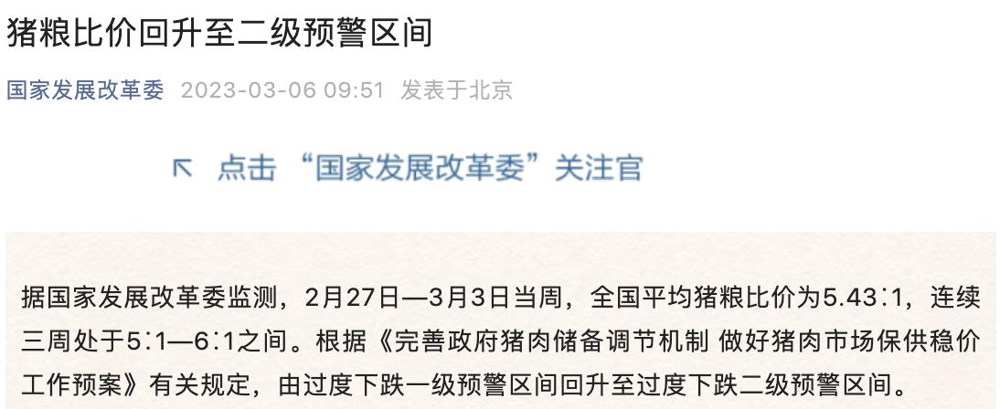 经济观察网讯 据国家发展改革委微信公众号3月6日消息,2月27日—3月3日当周,全国平均猪粮比价为5.43∶1,连续三周处于5∶1—6∶1之间。根据《完善政府猪肉储备调节机制 做好猪肉市场保供稳价工作预案》有关规定,由过度下跌一级预警区间回升至过度下跌二级预警区间。