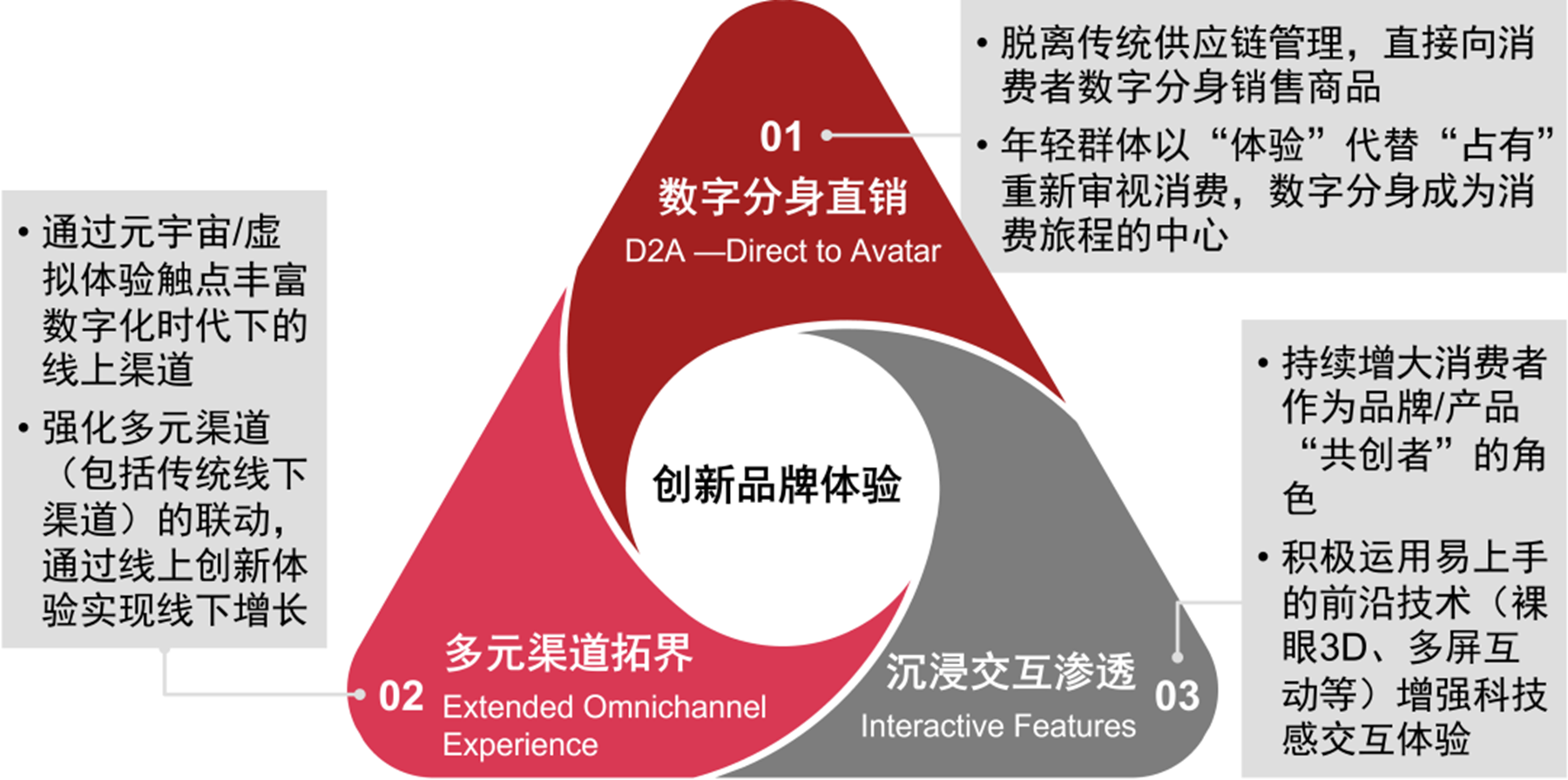 依托元宇宙,创新品牌体验可以数字分身直销(D2A —Direct to Avatar)、多元渠道拓界(Extended Omnichannel Experience)、沉浸交互渗透(Interactive Features)为三大抓手。