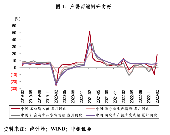 稍后公布的经济数据也确认了经济的企稳回升。1至2月份,规模以上工业增加值同比增长2.4%,较去年12月份加快了1.1个百分点,两年平均增速4.9%;服务业生产指数同比增长5.5%,而去年12月份同比下降0.8个百分点,表明工业生产保持稳定,服务业显著改善(见图1)。同期,社会消费品零售总额同比增长3.5%,两年平均增长5.1%,限额以上18类商品零售额中有12类回升,受疫情影响较大的餐饮收入增长9.2%;投资同比增长5.5%,比去年全年增速加快0.4个百分点,表明消费市场活力在回升,投资依然是扩内需的重要抓手。尤其是,大项目投资和基建投资带动作用明显。1至2月份,计划总投资亿元及以上项目投资同比增长13.1%,拉动全部固定资产投资增长6.1个百分点;基础设施投资同比增长9.0%,增速比全部固定资产投资高3.5个百分点。