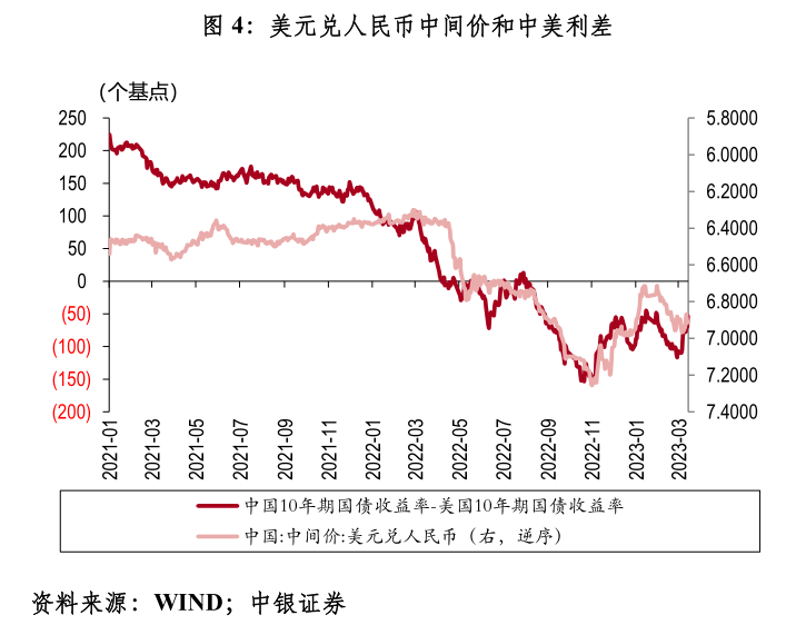 人民币汇率是内外平衡的自动稳定器,双向波动增强了货币政策的独立性。但没有央行能够完全独立于美联储,货币政策调整仍需承受汇率波动。虽然2022年我国贸易顺差持续扩大,但是资产价格属性主导了人民币汇率全年走势。由于稳增长压力上升和低通胀,我国货币政策逆势宽松,中美利差大幅收窄,人民币汇率明显承压。2022年11月初的中美利差倒挂低点恰好对应了美元对人民币中间价汇率的低点(见图4)。随着美联储紧缩尾部风险逐渐暴露,市场对美联储坚定反通胀的预期已经开始动摇,连带着对欧央行、日本银行和澳联储的紧缩预期也在下降。3月8日,加拿大央行更是率先宣布暂停加息。如此下去,汇率更难以成为我国货币政策的掣肘。