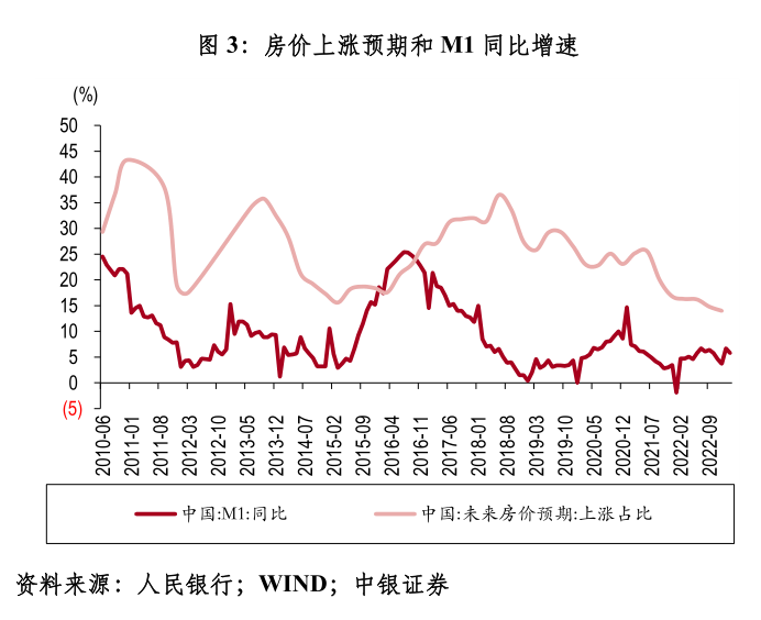 稳物价需妥善应对预期的自我实现。发达国家事后“灭火”的方式不可取,但是通胀低位就警示通胀风险也可能造成预期混乱和金融条件不必要紧缩。此外,我国通胀驱动模式可能已经转变,谁也猜不准未来通胀能达到何种水平。过去,我国依赖房地产驱动需求过热引发高通胀,传导途径为“货币宽松—M1显著活化—房价预期上涨—居民和企业贷款大幅多增—物价上升”。当前,中间传导面临两大不确定性:一是房价预期未见好转,2022年四季度央行储户调查显示的房价预期依然有所下滑,今年2月份70个大中城市新建商品和二手房的房价当月同比降幅较上月小幅收窄,企稳并不代表“房价长效”机制被打破,毕竟阶段性房贷利率下降政策有涨价后即暂停的限制;二是居民资产负债表尚处于修复阶段,主动加杠杆的意愿有待观察,2月份M1同比较上月下滑0.9个百分点至5.8%,与历次大通胀的高增速相去甚远(见图3)。