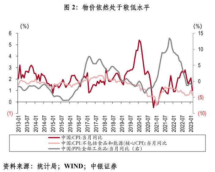 过去两年,外需为我国经济复苏提供了较大助力。由于外需承压,即便内需复苏,整体可能仍是供过于求的格局。2月份,我国制造业PMI的生产指数大幅反弹6.9个百分点至56.7%,反弹幅度远高于同期新订单指数的3.2个百分点,重现供给恢复快于需求的发展势头。我国内需复苏尚未达到潜在水平上方,产出缺口依然为负,通胀压力明显低于发达国家。1至2月份,我国工业企业产销率(销售值与工业产值比值,数值越高说明需求比供给越好)仅有95.8%,为2002年2月以来的新低,同比下降1.7个百分点,稍好于2022年3月和4月国内疫情防控严峻时期。