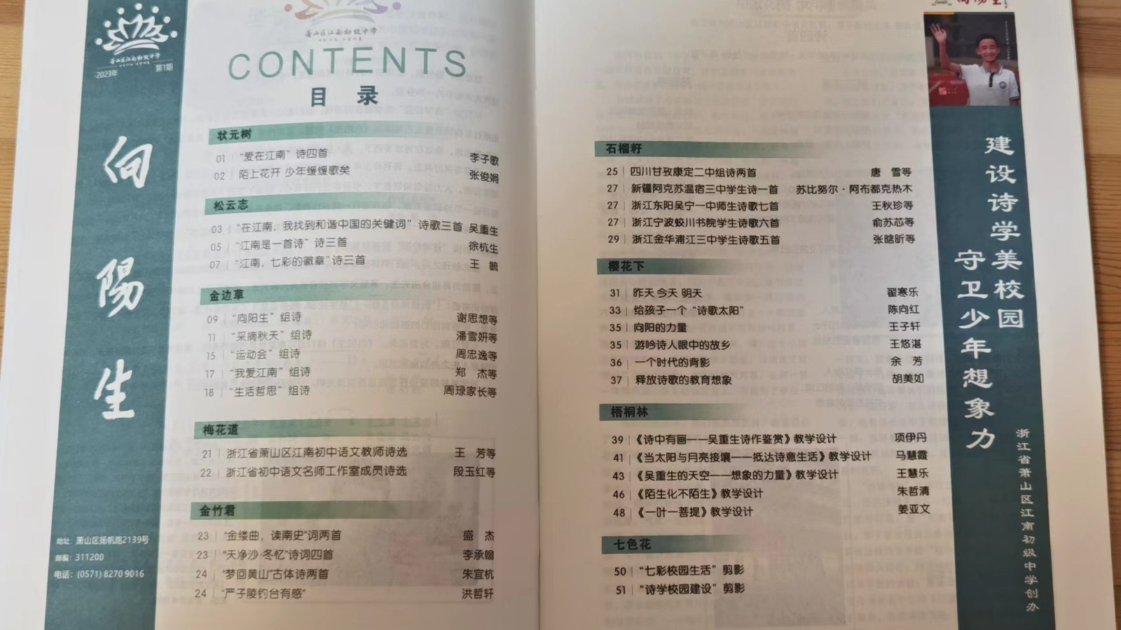 在校园内移植松树,是萧山区江南初中校园文化建设的重要组成部分。栽种当天,学校一楼梦想阶梯教室里正在播放音乐,一场名为“太阳被人围观”的诗歌分享会和“诗学校园”启动会正在这里隆重举行。谢冕、食指、艾伟等大咖纷纷在大屏幕上亮相,来自云南、四川、福建和浙江等地学校的师生们以诗的名义在此相聚。我有些恍惚:这是一个怎样的精神高地,能够让这么多的文化名人“云”集于此?我想,也许是这松树的呼唤吧!