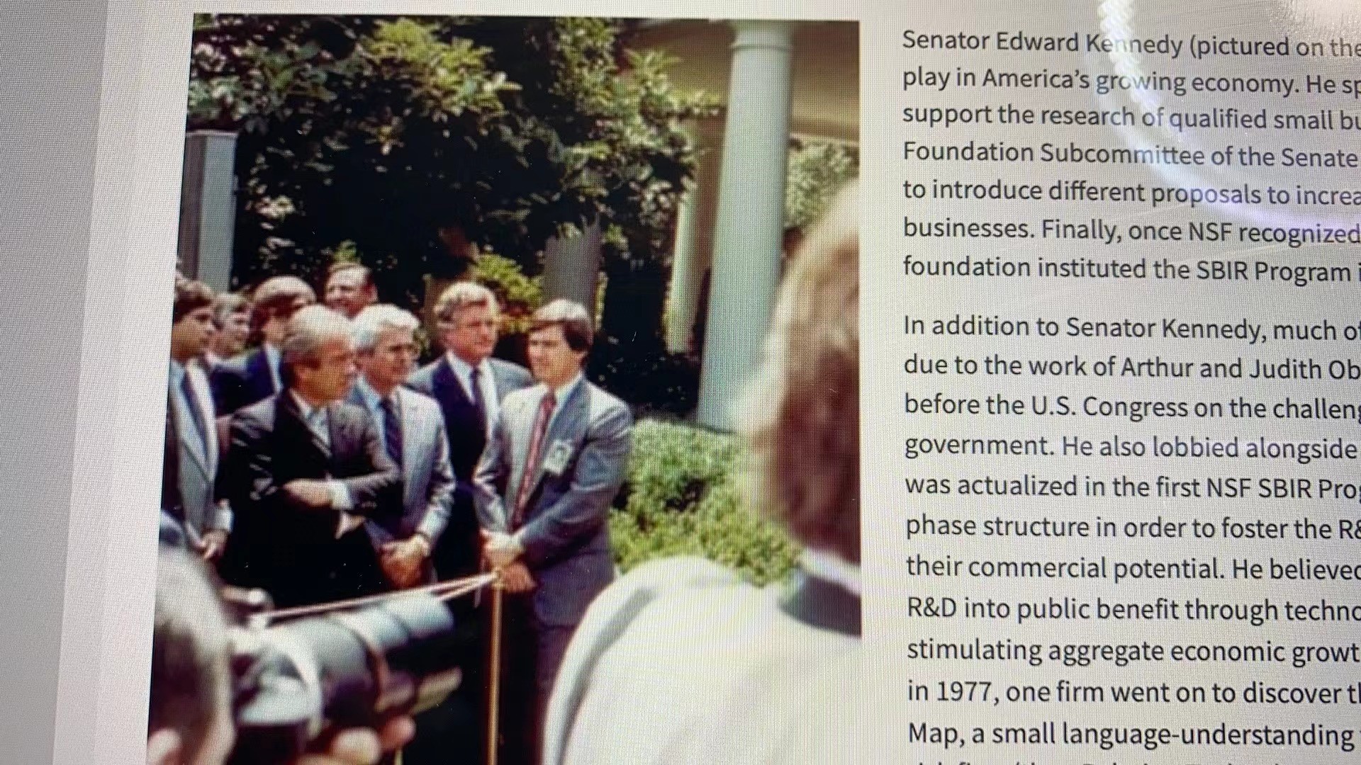 早在1970年,阿瑟·奥伯迈尔就在美国国会作证,讲述了小公司的研发工作在与政府打交道时面临的挑战。他还和肯尼迪一起游说最初的1974年国家科学基金会授权法案,该法案在罗兰·蒂贝茨设计的国家科学基金会第一个SBIR计划中得以实现。