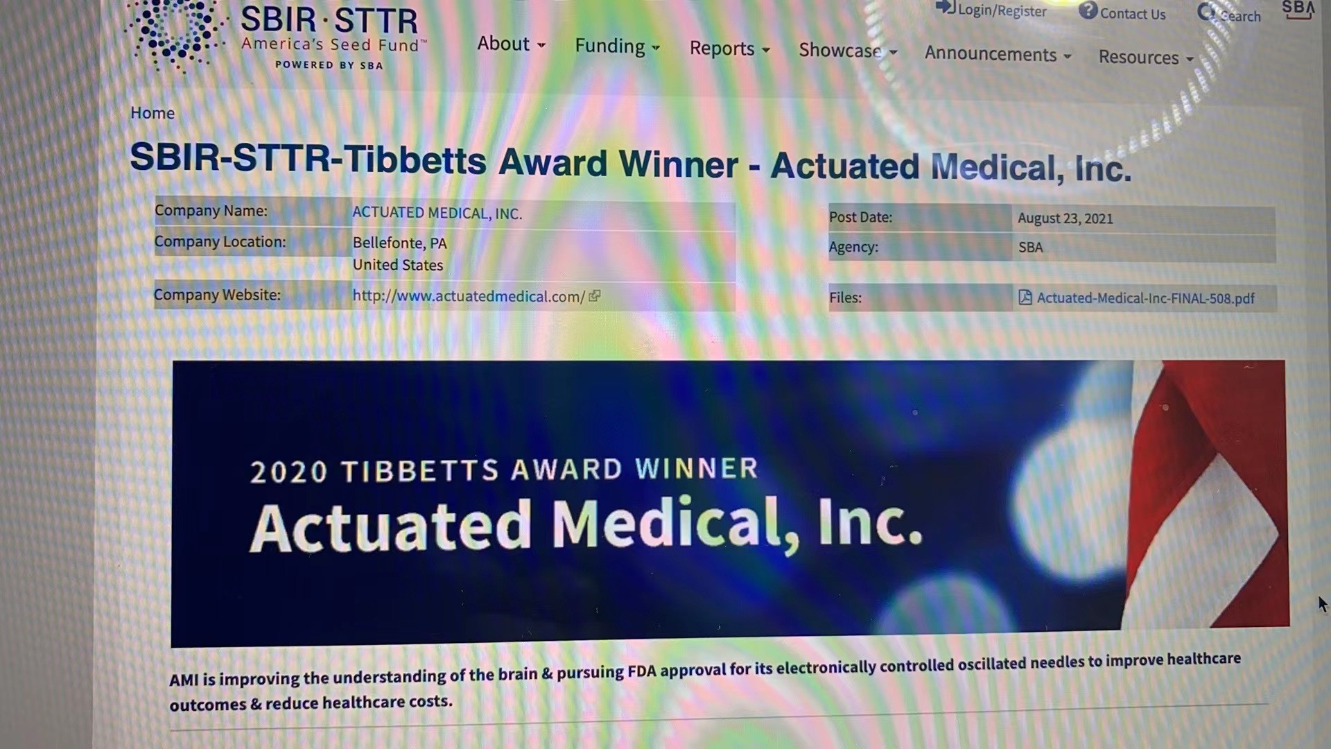 在过去的13年里,在莫琳·莫威希尔(Maureen Mulvihill)女士的领导下,莫威希尔博士,促动医疗公司总裁兼首席执行官已成为临床和临床前市场的领先产品开发商。该公司建立了一个强大的产品开发创业生态系统,可以创建并快速测试想法,其高度多样化和敬业的工程师和 科学家团队在根据认证的医疗器械质量管理体系标准(ISO13485)下工作时,以“客户的声音”为理念进行创作。该公司的产品帮助了数百名重症监护患者,并使研究人员能够收集数据以更好地了解大脑。促动医疗公司的目标是开发技术,使穿透 性神经电极阵列能够以最小的组织创伤和位移准确地放置在目标位置——最终为神经植入物的临床放置的微创手术 (MIS)方法铺平道路。使用小企业创新研究(SBIR)开发的电子控制振荡针头技术,AMI正在提高对大脑的理解——这是美国国立卫生研究院 (NIH)和国防高级研究项目局(DARPA)的医疗优先事项——同时仍在寻求食品和药物管理局(FDA)的批准,以改善 医疗保健结果并降低医疗保健成本。医疗器械开发有七个开发阶段,IntelliNeedle系统处于第5阶段,通过了FDA上市前应用所需的大多数验证和验证测试。目前,有8项美国专利支持这项技术,大约有20项专利申请正在申请中。该技术还 与DARPA一起过渡到第三阶段项目,神经韧带-皮质插入器(NeuralGlider-Cortical Inserter)现已商业化并产生销售。与SBIR计划合作使促动医疗公司的团队能够灵活地开发可以影响科学和医疗保健的创新技术。如果没有SBIR资金,神经韧带-皮质插入器将只存在于纸面上——这些资金 允许继续进行测试、开发和与地方、区域和国家研究人员建立伙伴关系。除了神经韧带-皮质插入器插入器的商业化外,促动医疗公司还成功将其他几种医疗设备商业化,包括其TubeClear ®系统。 促动医疗公司的资本效率高的位置使促动医疗公司距离几个顶级研究和临床设施的距离,从而有可能建立牢固的关系。在宾夕法尼亚州, 促动医疗公司正在与费城儿童医院、宾夕法尼亚州立大学和匹兹堡大学的临床医生和研究人员合作。SBIR资金允许促动医疗公司留在宾夕法尼亚州中部,为当地社区提供家庭维持工作,并为该地区的学生提供科学、技术、工程和数学外联和教育机会,并为附近的宾夕法尼亚州立大学的教师、当地医生和小企业提供商业化专业知识。