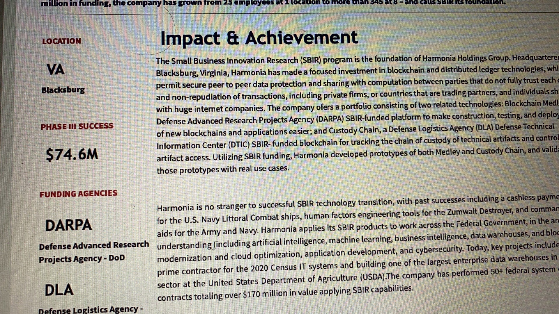 美国小企业创新研究(SBIR)计划是哈耳摩尼亚控股集团(Harmonia Holdings Group)成功的基础。哈耳摩尼亚公司在第一阶段和第二阶段的合同均系由国防高级研究项目局、国防后勤局提供融资协议,而到了第三阶段,哈耳摩尼亚赢得7460万美元的巨大成功。哈耳摩尼亚控股集团(以下简称“哈耳摩尼亚”)的网址https://www.harmonia.com,该公司总部位于弗吉尼亚州布莱克斯堡,对区块链和分布式分类账技术进行了重点投资,这些技术允许安全的对等对等数据保护,并在不完全信任彼此的各方之间进行计算共享,以及不否认交易,包括私人公司或贸易伙伴的国家,以及与大型互联网公司共享的个人。该公司拥有由两种相关技术组成的投资组合:区块链集锦,美国国防高级研究项目局SBIR资助的平台,使新区块链和应用程序的构建、测试和部署更容易;以及监管链,国防后勤局国防技术信息中心SBIR资助的区块链,用于跟踪技术工件的监管链和控制工件访问。利用SBIR融资,哈耳摩尼亚开发了区块链集锦和监管链的原型,并使用实例验证了这些原型。哈耳摩尼亚对成功的SBIR技术转型并不陌生,过去的成功包括美国的无现金支付系统。海军滨海战斗舰,祖姆瓦尔特驱逐舰的人为因素工程工具,以及陆军和海军的指挥/控制辅助工具。哈耳摩尼亚将其SBIR产品应用于整个联邦政府,在数据理解,包括人工智能、机器学习、商业智能、数据仓库和区块链、信息技术现代化和云优化、应用程序开发和网络安全等领域工作。如今的关键项目包括担任2020年人口普查信息技术系统的主要承包商,并在美国农业部建造民用部门最大的企业数据仓库之一。该公司已经执行了50多份联邦系统工程合同,总价值超过1.7亿美元,应用小企业创新研究功能。哈耳摩尼亚将国防高级研究项目局的SBIR方法描述为独特的,因为它促进了改变游戏规则的基本技术的发展,同时鼓励高风险或高回报的想法,这些想法可以推动SBIR技术取得成功,使公司能够应对风险创新。国防后勤局国防技术信息中心还为哈耳摩尼亚提供了一个真正的支持环境,以了解其SBIR工作如何帮助国防后勤局的独特使命。哈耳摩尼亚在第三阶段获得了超过7,460万美元的资金,包括后续资金和许可。自2006年以来,哈耳摩尼亚已从25名员工扩大到超过345名员工,通过雇用来自22个国家的员工,他们会说34种不同的语言,从而创造了一种多元化的文化。哈耳摩尼亚在美国5000家公司中是10年来增长最快的公司,今天在美国的8个地点都有公司,包括弗吉尼亚州(总部)、华盛顿特区、阿拉巴马州、加利福尼亚州和密苏里州。