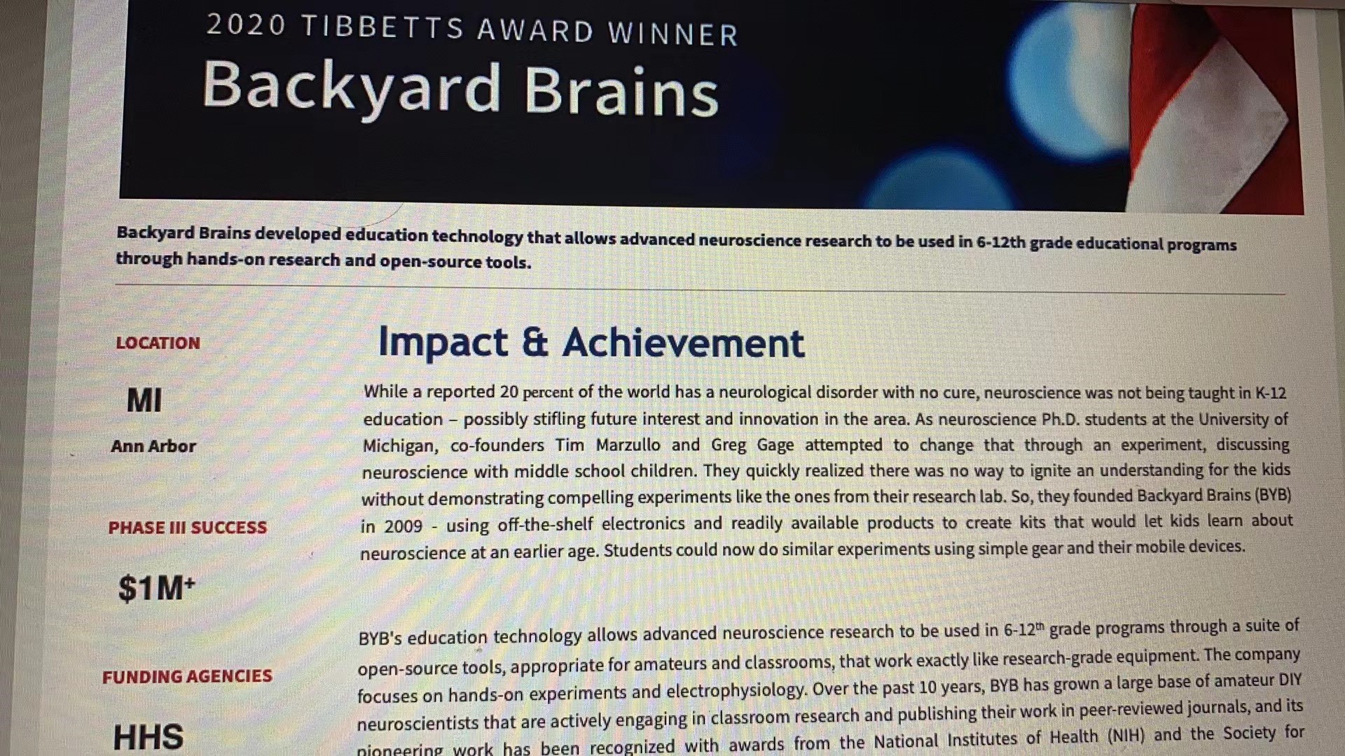 第一阶段的合同和第二阶段的合同均由联邦政府十一个机构之一的美国卫生与公众服务部提供资助、位于美国密歇根州安娜堡的一家公司“后院天才”(Backyard Brains) 开发了教育技术,通过动手研究和开源工具,允许将先进的神经科学研究用于6-12年级的教育项目。这家公司在第三阶段获得成功,得到100万美元以上的投资。虽然据报道,世界上有20%的人患有无法治愈的神经系统疾病,但K-12教育中没有教授神经科学——这可能会扼杀该领域的未来兴趣和创新。作为密歇根大学的神经科学博士生,联合创始人Tim Marzullo和Greg Gage试图通过一个实验来改变这种情况,与中学生讨论神经科学。他们很快意识到,如果不展示像他们研究实验室那样的令人信服的实验,就无法激发孩子们的理解。因此,他们在2009年创立了Backyard Brains(BYB)-使用现成的电子产品和现成的产品来创建工具包,让孩子们在更早的时候学习神经科学。学生现在可以使用简单的齿轮和移动设备进行类似的实验。BYB的教育技术允许通过一套开源工具在6-12年级的课程中使用先进的神经科学研究,这些工具适合业余爱好者和教室,这些工具的工作方式与研究级设备完全相同。该公司专注于动手实验和电生理学。在过去的10年里,BYB培养了大量业余DIY神经科学家,他们积极参与课堂研究,并在同行评审期刊上发表他们的工作,其开创性工作得到了美国国立卫生研究院(NIH)和神经科学学会的融资协议的认可。美国国立卫生研究院小企业创新研究计划(SBIR)和通过研究所提供的其他计划为该公司成功将其产品商业化提供了资金和指导。产品销售缓慢,直到有了SBIR补助资金使BYB从一个小型外展项目发展到一家成功的神经科学教育技术公司。现在有超过10,000所学校和大学在使用其装备,BYB体现了SBIR计划的目标。BYB正在为学生提供进入神经科学研究的管道——并在此过程中创造了一个新的市场!2011年,BYB获得了国家心理健康研究所(NIMH)SBIR补助款,使该公司能够开始扩大其研究和产品开发工作。基于开发的技术,BYB被要求在2012年的TED舞台上演讲。它的第二次TED演讲推出了该公司的人机界面,由SBIR资助。人与人界面是一个耸人听闻的电生理学演示和实验,它激励了数百万人更多地了解我们大脑和神经系统中的电。当老师们观看公司的会谈时,他们开始看到课堂上可能发生的事情,销售额也增长了。通过SBIR融资使该公司能够雇用优质人员并开发流程,以高效、经济实惠地开发和商业化新产品。如今,在过去的三年里,BYB的年销售额已增长到100万美元,其热门视频的浏览量已超过3500万。此外,该公司已经生产和销售了2万多个工具包,并创建了50多个免费实验——有600多万独立访客——使学生和教育工作者能够在课堂上进行真正的动手神经科学。
